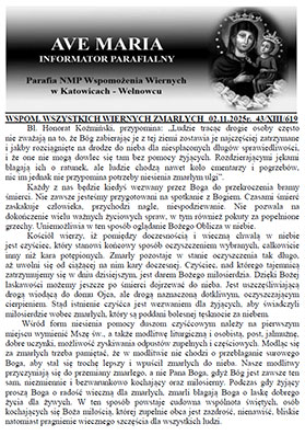 Na tej zakładce prezentujemy państwu numery gazetki Ave Maria które otrzymaliśmy od wydawcy. Do otwarcia Informatora Ave Maria wymagany jest program Adobe Reader. Ukazał się już Dwumiesiecznik gazetki AVE Maria. Przedstawiamy pierwszą stronę gazetki i zachęcamy do jej kupna. Ukazał się już cotygodniowy numer Informatora AVE Maria. Otrzymać go można od ministrantów w przedsionka kościoła. Zachęcamy do jego pobierania. AVE MARIA - Informator parafialny - 02 Listopad 2025Zapowiedzi ślubne. .................. Poprzez linki można połączyć się z następującymi wydawnictwami czasopism katolickimi: INTERNETOWE WYDANIE GOŚCIA NIEDZIELNEGO. INTERNETOWE WYDANIE MAŁEGO GOŚCIA NIEDZIELNEGO. INTERNETOWE WYDANIE NIEDZIELI.Wychodząc z kościoła, w przedsionku można nabyć najnowsze numery oryginalnych wydań . Inne Wzór "Oświadczenia" dla rodziców w sprawie warunków wykonywania praktyk religijnych swoich dzieci na koloniach i obozach. Wzór "Oświadczenia" dla rodziców - Stop Deprawacji Dzieci i Młodzieży!-Apel Komisji Wychowania Katolickiego KEP. PG PANTENON GÓRNOŚLĄSKI. KSIĘGA KSIĘŻY PARAFII - tylko do użytku własnego- Dane na podstawie: "E-ncyklopedia wiedzy o Kościele katolickim na Śląsku" oraz własne info. |