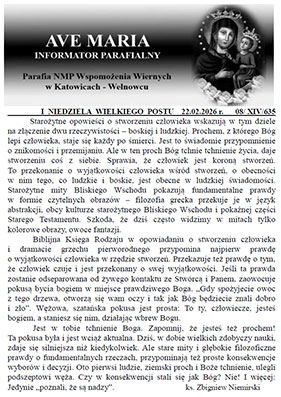 Na tej zakładce prezentujemy państwu numery gazetki Ave Maria które otrzymaliśmy od wydawcy. Do otwarcia Informatora Ave Maria wymagany jest program Adobe Reader. Ukazał się już Dwumiesiecznik gazetki AVE Maria. Przedstawiamy pierwszą stronę gazetki i zachęcamy do jej kupna. Ukazał się już cotygodniowy numer Informatora AVE Maria. Otrzymać go można od ministrantów w przedsionka kościoła. Zachęcamy do jego pobierania. AVE MARIA - Informator parafialny - 22 Luty 2026Zapowiedzi ślubne. .................. Poprzez linki można połączyć się z Archidiecezją Katowicką, Duszpasterską Rodzin Arcidiecezji Katowickiej oraz następującymi wydawnictwami czasopism katolickimi: ARCHIDIECEZJA KATOWICKA. DUSZPASTERSTWO RODZIN ARCHIDIECEZJI KATOWICKIEJ. Kalendarz liturgiczny archidiecezji katowickiej na rok 2026 - ORDO . INTERNETOWE WYDANIE GOŚCIA NIEDZIELNEGO. INTERNETOWE WYDANIE MAŁEGO GOŚCIA NIEDZIELNEGO. INTERNETOWE WYDANIE NIEDZIELI.Wychodząc z kościoła, w przedsionku można nabyć najnowsze numery oryginalnych wydań . Inne Wzór "Oświadczenia" dla rodziców w sprawie warunków wykonywania praktyk religijnych swoich dzieci na koloniach i obozach. Wzór "Oświadczenia" dla rodziców - Stop Deprawacji Dzieci i Młodzieży!-Apel Komisji Wychowania Katolickiego KEP. PG PANTENON GÓRNOŚLĄSKI. KSIĘGA KSIĘŻY PARAFII - tylko do użytku własnego- Dane na podstawie: "E-ncyklopedia wiedzy o Kościele katolickim na Śląsku" oraz własne info. |