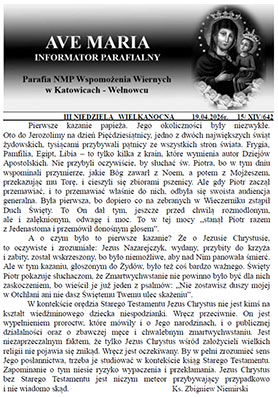 Na tej zakładce prezentujemy państwu numery gazetki Ave Maria które otrzymaliśmy od wydawcy. Do otwarcia Informatora Ave Maria wymagany jest program Adobe Reader. Ukazał się już Dwumiesiecznik gazetki AVE Maria. Przedstawiamy pierwszą stronę gazetki i zachęcamy do jej kupna. Ukazał się już cotygodniowy numer Informatora AVE Maria. Otrzymać go można od ministrantów w przedsionka kościoła. Zachęcamy do jego pobierania. AVE MARIA - Informator parafialny - 19 Kwiecień 2026Zapowiedzi ślubne. .................. Poprzez linki można połączyć się z Archidiecezją Katowicką, Duszpasterską Rodzin Arcidiecezji Katowickiej oraz następującymi wydawnictwami czasopism katolickimi: ARCHIDIECEZJA KATOWICKA. DUSZPASTERSTWO RODZIN ARCHIDIECEZJI KATOWICKIEJ. Kalendarz liturgiczny archidiecezji katowickiej na rok 2026 - ORDO . INTERNETOWE WYDANIE GOŚCIA NIEDZIELNEGO. INTERNETOWE WYDANIE MAŁEGO GOŚCIA NIEDZIELNEGO. INTERNETOWE WYDANIE NIEDZIELI.Wychodząc z kościoła, w przedsionku można nabyć najnowsze numery oryginalnych wydań . Inne Wzór "Oświadczenia" dla rodziców w sprawie warunków wykonywania praktyk religijnych swoich dzieci na koloniach i obozach. Wzór "Oświadczenia" dla rodziców - Stop Deprawacji Dzieci i Młodzieży!-Apel Komisji Wychowania Katolickiego KEP. PG PANTENON GÓRNOŚLĄSKI. KSIĘGA KSIĘŻY PARAFII - tylko do użytku własnego- Dane na podstawie: "E-ncyklopedia wiedzy o Kościele katolickim na Śląsku" oraz własne info. |