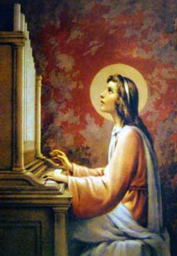 Wspomnienie św. Cecylii, dziewicy i męczennicy 22 listopada 2025; Rok C, I: Według tradycji święta Cecylia pochodziła z rodziny rzymskich patrycjuszy. W młodości ślubowała dziewictwo z miłości do Chrystusa. Poniosła śmierć za wiarę za panowania cesarza Marka Aureliusza (161-180). W V w. wzniesiono w Rzymie bazylikę ku jej czci. Jest jedną z najsławniejszych męczennic Kościoła Rzymskiego. Jej imię włączono do mszalnego Kanonu Rzymskiego, a także do Litanii do Wszystkich Świętych, co jest wyjątkowym wyróżnieniem. Jej ciało, pochowane w katakumbach niedaleko grobów papieskich. W VIII w. przeniesiono jej relikwie do bazyliki wzniesionej ku jej czci i umieszczono w sarkofagu pod ołtarzem. Z tego samego wieku pochodzi antyfona brewiarzowa: "Cantantibus organis, Caecilia in corde suo soli Domino decantabat", co miało dać początek jej patronatowi nad muzyką kościelną. Przypuszcza się, że Cecylia mogła grać na harfie, ponieważ wtedy patrycjuszki rzymskie często grały na tym instrumencie. Wtedy rodziny patrycjuszów miały w swoich pałacach również organy. Cecylia mogła więc znać ten instrument. Według podania Cecylia lubiła śpiew i muzykę, co też nie było bez znaczenia. Kult św. Cecylii jako patronki muzyki kościelnej popularyzowały bractwa i stowarzyszenia pod jej patronatem. Ich głównym celem było pielęgnowanie muzyki kościelnej odpowiadającej duchowi liturgii. W ikonografii św. Cecylia przedstawiana jest jako orantka. Późniejsze prezentacje ukazują ją w tunice z palmą męczeńską w dłoni. Czasami gra na organach. Jej atrybutami są: anioł, instrumenty muzyczne - cytra, harfa, lutnia, organy, płonąca lampka, miecz, wieniec z białych i czerwonych róż - oznaczających jej niewinność i męczeństwo. |