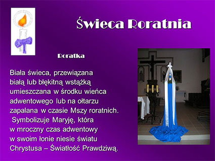 RORATY Roraty, adwentowe msze odprawiane o wschodzie Słońca, podkreślają wyjątkowość tego okresu. Nazwa "roraty" pochodzi od zwyczajowej pieśni na wejście (introitu), rozpoczynającej się od słów "Rorate caeli desuper" - "Spuśćcie rosę niebiosa". Msza roratnia, czyli msza wotywna o Najświętszej Maryi Pannie w okresie Adwentu, jest śladem dawnego obchodzenia święta Zwiastowania Pańskiego w okresie Adwentu - 18 grudnia. W starożytnych i średniowiecznych księgach liturgicznych polecano odprawianie tej mszy o Najświętszej Maryi Pannie w tygodniu poprzedzającym Boże Narodzenie lub nawet przez cały Adwent. Tak wyjątkowa obecność Matki Bożej w Adwencie ma głęboki sens. Maryja jest mistrzynią adwentowego oczekiwania. Jako córka Izraela, jako Matka Pana Jezusa i jako Matka Kościoła. Z Izraelem czekała na Mesjasza, a kiedy Anioł zwiastował jej, że pocznie i porodzi Syna, Emmanuela, oczekiwała na Życie, które cudownie w niej wzrastało. Razem z Kościołem czeka na przyjście chwalebnego, uwielbionego Chrystusa, a królując w niebie razem z Nim, wspiera Kościół w jego oczekiwaniu na ostateczny Dzień Pański. ![]() |