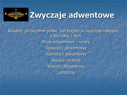 ADWENT Łacińskie słowo adventus jest tłumaczenia greckiego epifaneia i parusia. Termin ten w Rzymie oznaczał oficjalny przyjazd dygnitarza państwowego po objęciu urzędu. W języku natomiast religijnym oznaczał coroczne przebywanie bóstwa do świątyni, czy miejsc uprzedniej manifestacji. Przyjście to połączone było z uświęcającymi działaniem bóstwa i przebywaniem między wyznawcami. Rocznice takie przyjścia obchodzono uroczyście. Filokalus użył słowa adventus na określenie dnia wystąpienia Konstantyna na tron cesarski. W chrześcijaństwie termin adventus stał się klasycznym wyrażeniem na oznaczenie przyjścia Chrystusa. tak w sensie Wcielenia, jak również powtórnego przyjścia w chwale. w V w. na oznaczenie czasu przygotowania do Narodzenia Pańskiego spotykamy także określenie; ante natale Domini lub adventus Domini. ![]() Okres ten został ustanowiony w Kościele w IV wieku, podczas Synodu w Saragossie w 380 roku. W VI wieku papież Grzegorz Wielki zalecił, by Adwent trwał cztery tygodnie. Okres ten niemal od samego początku miał mieć radosny wydźwięk (oczekiwanie na narodzenie Zbawiciela), jednocześnie jednak powinien skłaniać do refleksji i pokuty, dlatego ustalono, że kapłani będą nosić w tym okresie fioletowe szaty liturgiczne. ![]() ![]() Bóg daje nam kolejny Adwent do przeżycia. Bo oto rozpoczyna się nowy liturgiczny rok. Znowu szansa przeżywania naszego życia jakby od nowa, w świetle z większą niż przedtem przez nas uświadomioną obecnością Boga, który nie zniechęcając się realizuje wciąż dzieło naszego. A my dlaczego wciąż śpimy, mimo że "noc się posunęła, a przybliżył się dzień". Symbole i zwyczaje Adwentowe. Z okresem Adwentu związane są różne symbole i zwyczaje. Wieniec adwentowy zrobiony jest z gałązek drzewa iglastego, najczęściej ze świerku i sosny. W kolistym wieńcu umieszcza się 4 świece. Każda ze świec symbolizuje kolejną niedzielę Adwentu i jest tego dnia podczas wspólnej modlitwy lub posiłku zapalana. Pomysł na wieńce adwentowe pojawił się w Niemczech ok. 1830 roku. Innym przykładem tradycji zaczerpniętej od niemieckich luteran z tego okresu jest kalendarz adwentowy. Służył on do odliczania dni od pierwszego dnia Adwentu aż do Wigilii Bożego Narodzenia. Przykładem naszych lokalnych zwyczajów związanych z okresem Adwentu jest gra na ligawkach. Ligawka to wygięty łukowato, wykonany z drewna instrument w formie rogu o długości około 1 metra. Grane na nim smętne melodie przed wschodem słońca mają przypominać ludziom o nieuchronnym nadejściu końca świata i obwieszczają nadejście Syna Bożego. Zwyczaj ten ma związek z Roratami czyli mszą roratną. Jest to pierwsza msza w okresie adwentu celebrowana o wschodzie słońca. Jednak coraz częściej żeby umożliwić dzieciom udział w mszy Roraty są przenoszone na wieczór, albo późne popołudnie. Podczas Rorat, które są mszą wotywną dla Najświętszej Maryi Panny, zapala się dodatkową świecę - roratkę, która symbolizuje obecność czuwającej Maryi. ![]() Zwyczaje Adwentowe ![]() Msza Roratnia ![]() Świeca roratnia ![]() Wieniec Adwentowy Wieniec adwentowy wywodzi się z symboli światla ![]() Lampiony Adwentowe ![]() Świece Adwentowe ![]() Kalendarze Adwentowe |